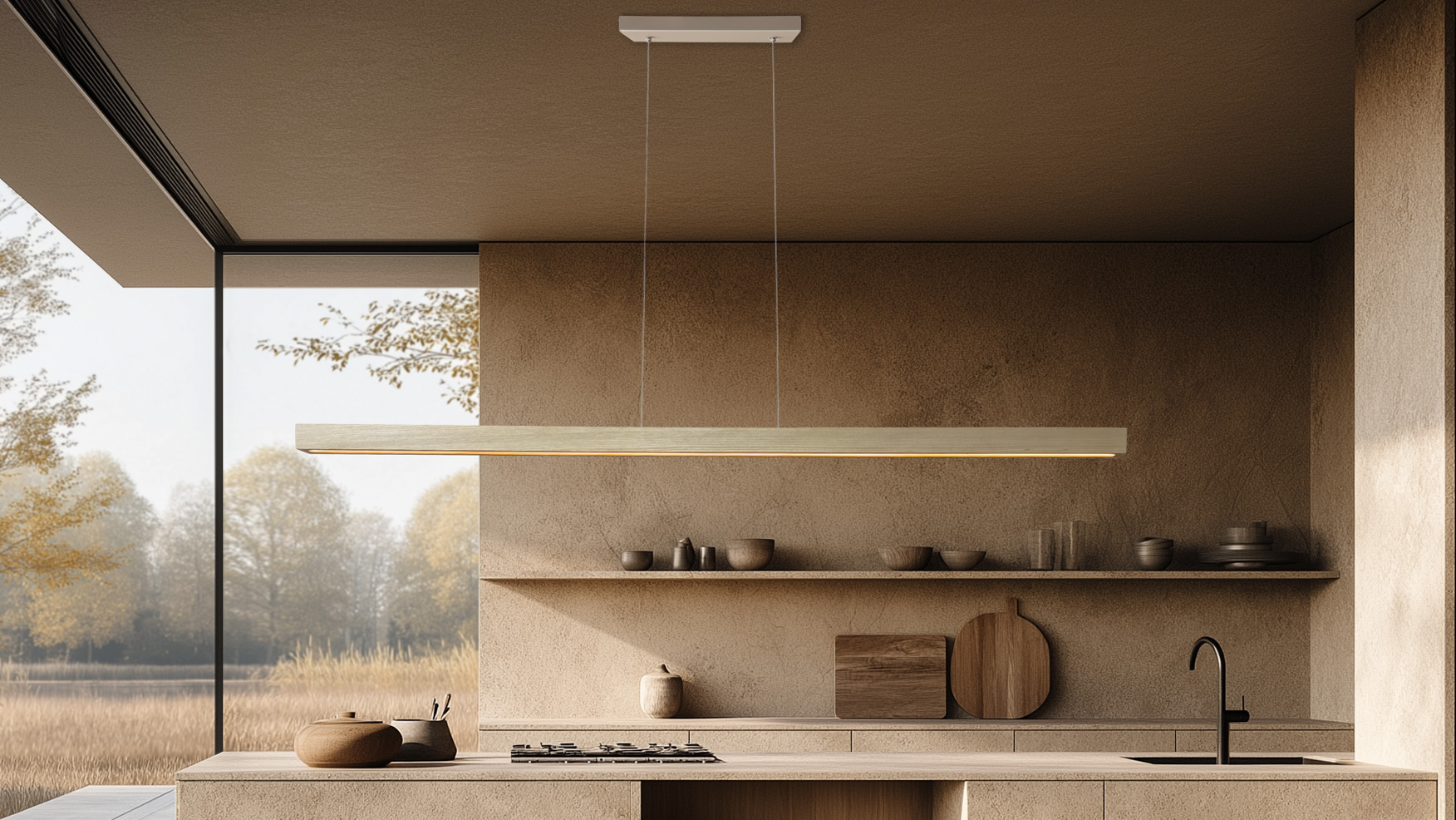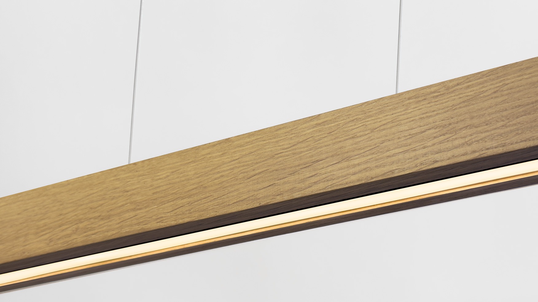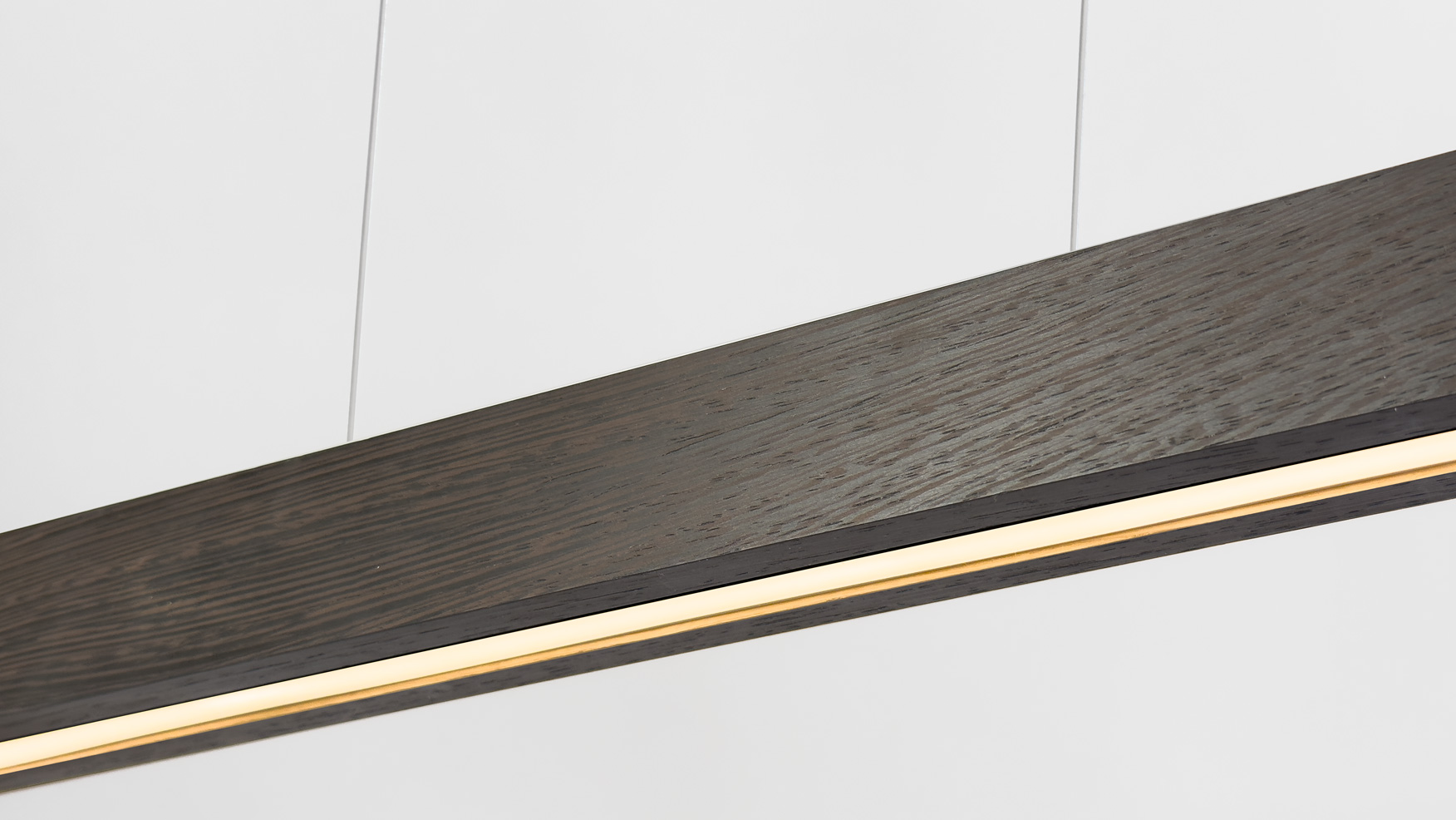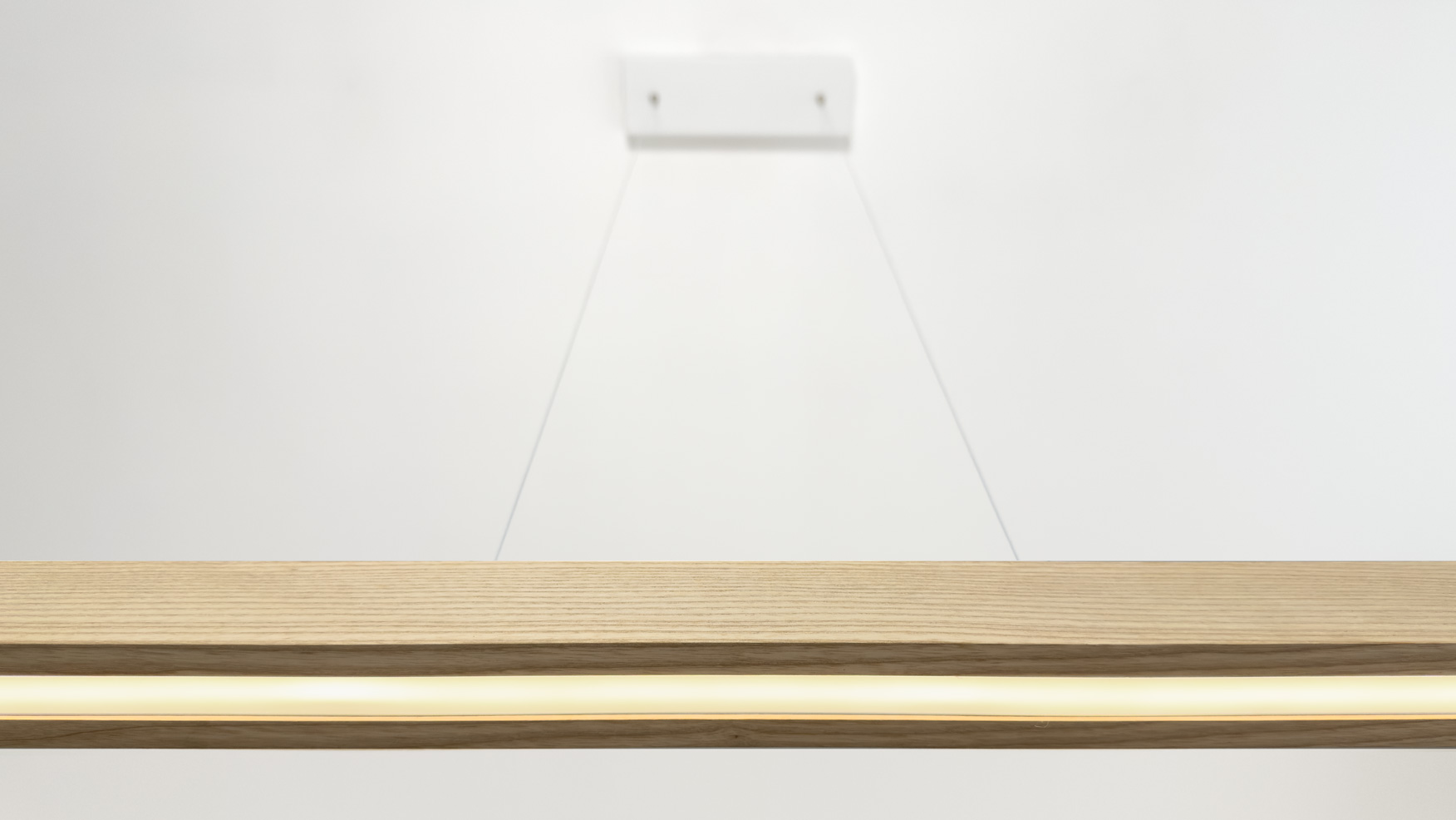 Dankzij de subtiele staaldraden, waarin ook de stroomvoorziening is geïntegreerd, behoudt de lamp een strakke en minimalistische uitstraling zonder zichtbaar snoer. Eenvoudig in hoogte verstelbaar en volledig aanpasbaar in formaat, houtsoort en afwerking.